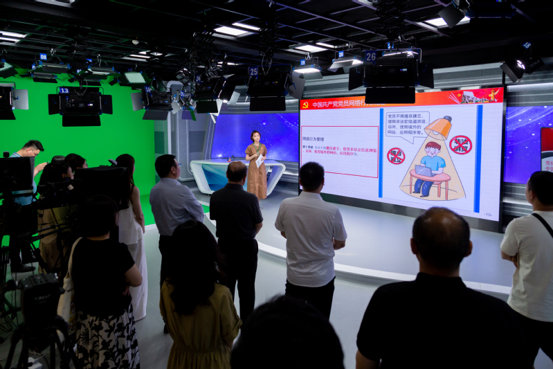 第三个环节,结合三个联建支部均与互联网络密切相关的工作特点,来到徐州移动融媒体中心智慧演播室开展党纪学习教育。中共中央年初发布了《中国共产党党员网络行为规定》,成为我党纪律体系的组成部分,每个党员都需要学习、了解和遵守。校信息化处处长、机关二十二支部书记宋子强主持活动,宣传部副部长、机关四支部副书记殷子钰以微党课的方式,对规定的基本情况进行了介绍,带领党员同志们一起特别针对“网络正能量传播”和“网络行为管理”的主要内容进行了重点学习。通过学习和研讨,党员同志对这一规定有了更全面的了解和理解,增强了对网络行为的规范意识和纪律意识。
